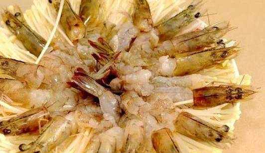 3、去掉虾线、去掉虾头,从后面切开虾肉,但不要全部切开,保留虾壳,把蘑菇摆在碟子里,把虾做好。