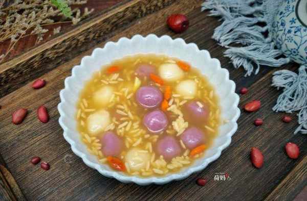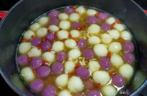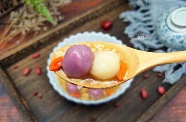 食材:糯米粉,紫薯粉,红糖,酒酿,枸杞,生姜