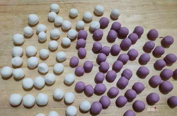 做法:糯米粉300克加适量的温开水,揉成干湿合适的面团,取一半糯米团,加入10克左右的紫薯粉揉搓均匀即可。也可以蒸熟的紫薯泥或南瓜泥中加糯米粉揉成面团。