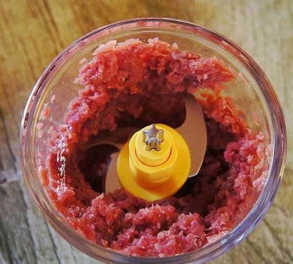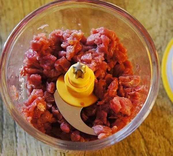 第6步、用手按住料理机电源开关,坚持30秒,牛肉馅就打好了,240g牛肉打2次,很快。