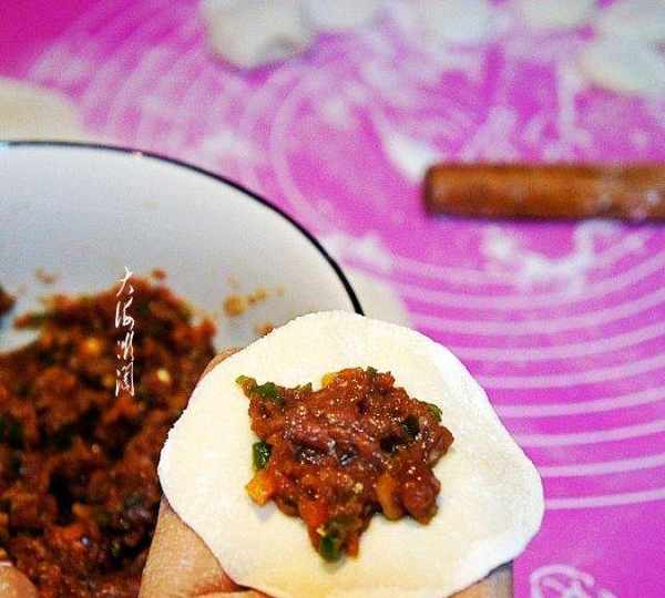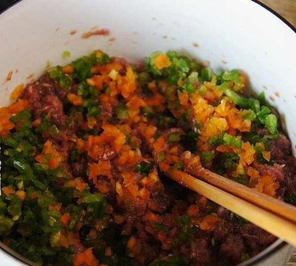 第7步、打好的牛肉馅放入大碗中,加入适量的老汤,没有老汤适量加点水,沿一个方向搅拌均匀,让牛肉吸收一些汁水。然后加入葱姜、料酒、酱油、少许盐、胡椒粉拌匀,最后加入花生油、蚝油拌匀,加入青红椒碎。