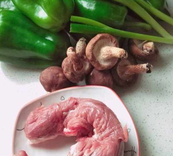 第1步、里脊肉大约400克,香菇8个,青椒6个,香葱3棵。