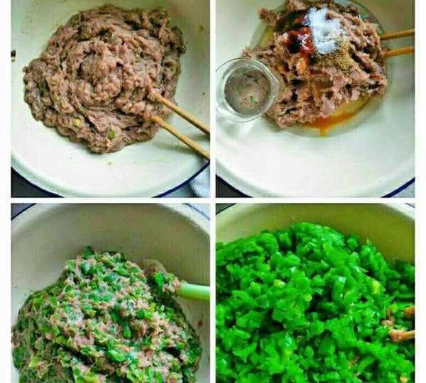 第4步、肉馅加点油,盐,五香粉,香油,蚝油,用100ml水绞上劲,然后加上青椒搅拌成馅。