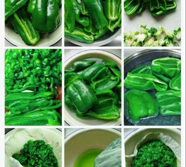 第3步、青椒掰开,洗净,焯水烫蔫就行,然后过凉,切碎攥干备用。