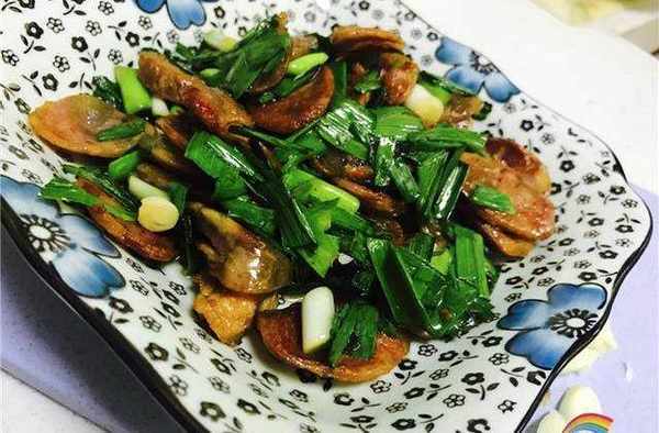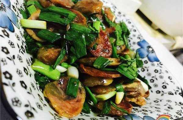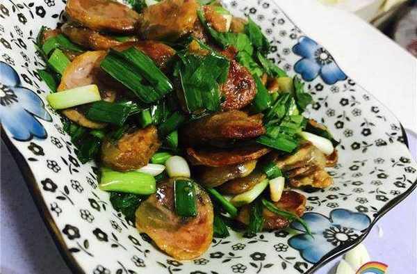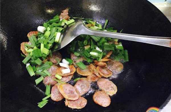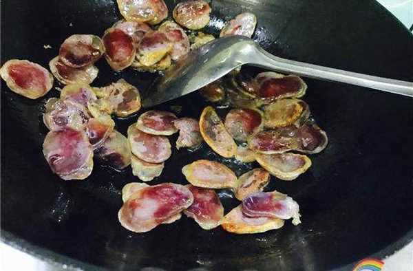 等香肠变色出油之后倒入大蒜翻炒