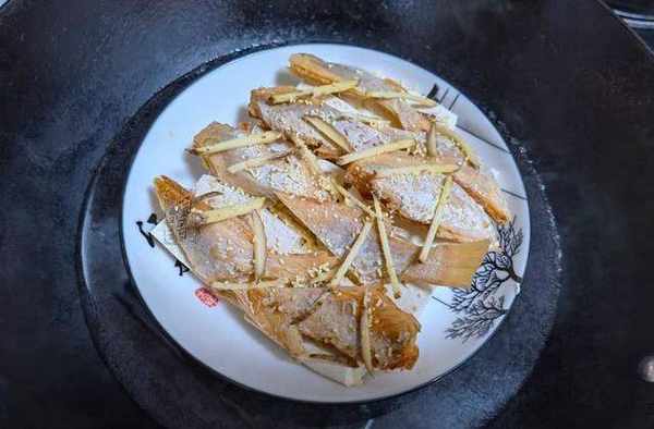 6、然后再放入适量的鸡精和切好的姜丝,鸡精可以起到提鲜的作用,姜丝可以更好地去除鱼腥味,因为咸鱼本身够咸,这里不需要再放入盐这类调味料了,然后取出一口锅,擦拭干净之后,倒入适量的清水,将盘子放入锅中。开中火进行蒸煮。