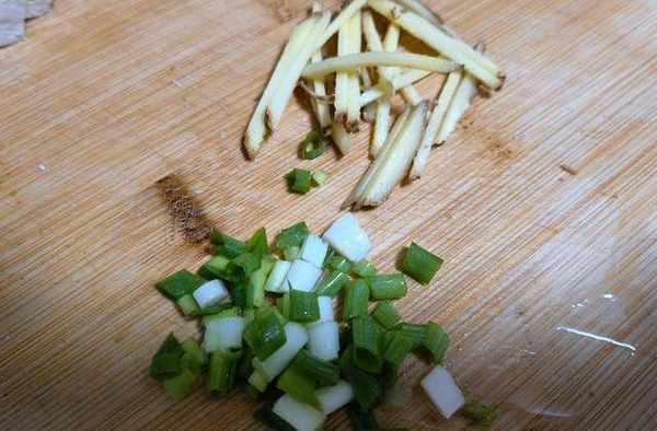 4、再准备其他会用到的食材,将葱洗净切成葱花状,将生姜洗净切成姜丝备用。