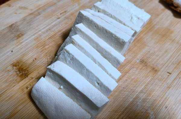 3、再准备一块新鲜的嫩豆腐,豆腐的清香可以帮助减轻咸鱼的油腻感,将豆腐洗净之后放在砧板上切成厚度一致的豆腐块,如图所示模样即可。