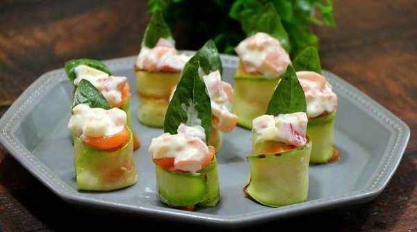 7、 取西葫芦条,上面放上三文鱼片,中间放上一个九层塔,然后从一段卷起来;