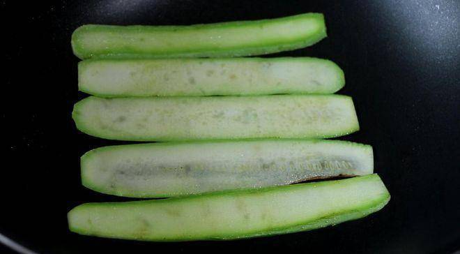3、 锅烧热,加入一点黄油,将切好的西葫芦放入进去煎一下,煎到表面微黄就可以出锅;