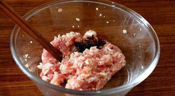 3、 用力在肉馅里面搅拌均匀,搅打上劲;