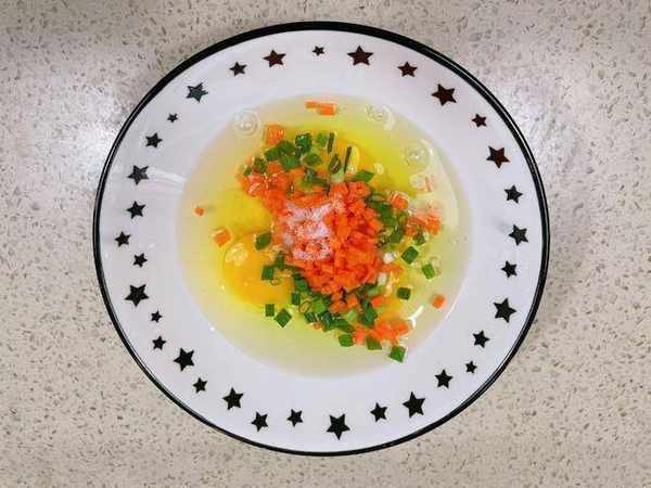 3、 碗中打入3个鸡蛋,然后将胡萝卜丁和小葱丁一起放入进去,用筷子打散,加入适量的盐;