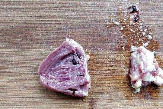 4.把所有的鸡心都这么处理之后,只保留左边部分,右边的杂物都丢掉。切出心管和脂肪,是除腥的第二步