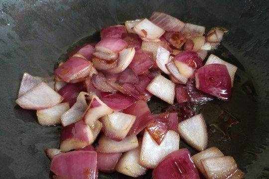 8.在炒锅中倒入植物油,烧热后倒入洋葱块,中火煸炒到洋葱边缘发黄变软