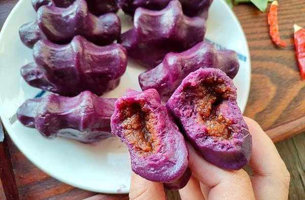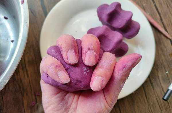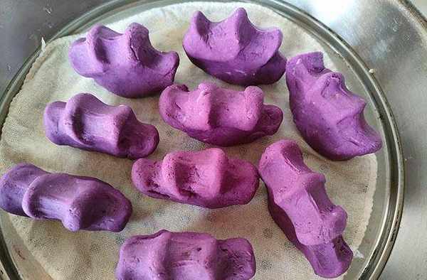 这道紫薯豆沙软饼的原材料有紫薯、豆沙、淀粉和糯米粉,整个制作过程不放一点油,连糖分也只是紫薯和豆沙里面自带的,并不会额外添加。做的时候将紫薯蒸成紫薯泥,然后放入一定比例的淀粉、糯米粉揉匀,取一小块包上豆沙馅,然后放在手上一捏,捏成较为特殊的手掌造型,最后放入锅中蒸8分钟,不用烤箱等复杂食材,简单方便。蒸好的紫薯豆沙软饼吃着糯香甜,味道特别棒,深受家人的喜爱,下面教大家具体做法。