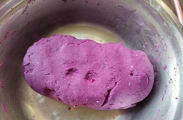 2、蒸好的紫薯压成紫薯泥,然后放入15克糯米粉、10克淀粉揉成面团。