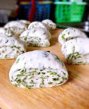 面团醒发好后,将已经拌好的榆钱揉进已发酵好的面团中,一定要将榆钱挤干水份,再揉进面团中。
