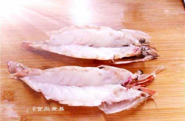 用剪刀在大虾的背部剪开,取出虾肠和虾脑,洗净沥干水,再用刀背轻轻拍扁,蒸熟后就不会卷成一团,样子好看些;