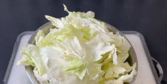 1. 买一颗两三块钱的包菜,从中间对半切开,去掉根部,用手把包菜掰开,撕成小块,放入盆中,加清水,用手抓洗干净,然后捞出控干水分。
