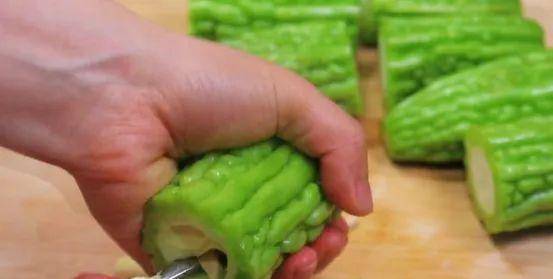 2. 洗干净后,把苦瓜放在案板上,切掉两端的苦瓜头,再切成一根手指一样的长段,接着用勺子挖出瓜瓤。