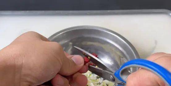 2. 拿出家里的三四颗大蒜,拍扁剁碎,还有一小节大葱,切成葱花,切好以后和蒜一起放在碗中。再往里面剪入几个干辣椒小段。