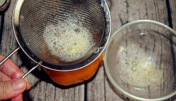 4、把蛋液通过滤网倒入甜椒里,用滤网过滤掉蛋液里的泡沫。