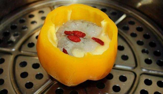 6、蒸8分钟时,鸡蛋基本定型,打开甜椒盖子,放入虾仁和几粒枸杞,盖上甜椒盖和锅盖,继续蒸5分钟即可出锅,食用前点几滴香油味道更好。