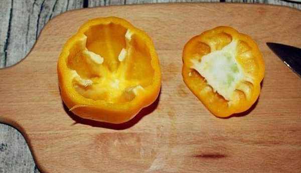 2、甜椒从顶部切四分之一,把辣椒籽全部掏掉,成空心状。