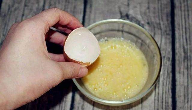 3、把鸡蛋打匀,然后加入约1.5倍的温水和少许细盐,朝一个方向搅拌均匀(可以用鸡蛋壳量水)。