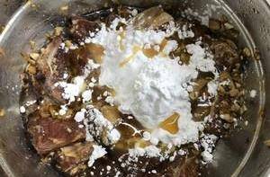 4、腌制好的排骨捡出姜片,加入少量的淀粉,食用油搅拌均匀,这样使蒸出的排骨更滑嫩。