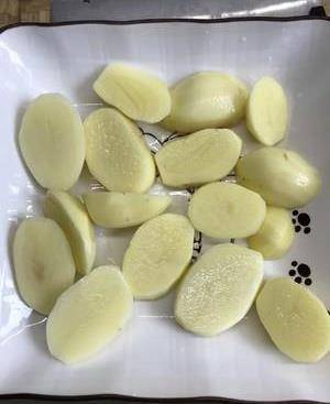 5、土豆洗净切厚片。铺在盘子底部。