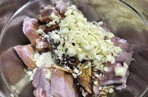 2、沥干水分, 拌入调料:盐少许(因为加了酱油),味极鲜,老抽少许,鱼露适量(提鲜),蚝油,胡椒粉,鸡粉,酒酿,姜片,大量的蒜末,拌匀,腌制至少2小时入味。注意:多抓拌一会儿,使排骨吸收更多的料汁,蒸出来会更软嫩。