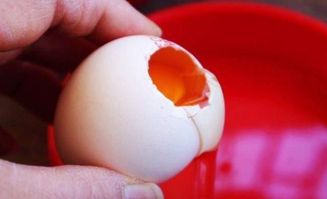 第二步:将鸡蛋清洗干净,在鸡蛋头较大的一面磕一个小洞洞,然后用小剪子把小洞洞的周边剪得尽量圆滑些;