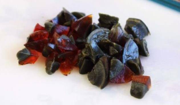 第一步:先将松花蛋外表清洗干净,去掉外壳,将黑黝黝的松花蛋切成小块备用;