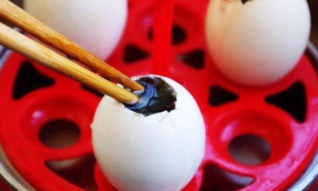 第四步:将到了蛋清的鸡蛋放上快速煮蛋器上,用筷子将小块的松花蛋若干块夹到鸡蛋里,用筷子轻轻地往里戳戳松花蛋;