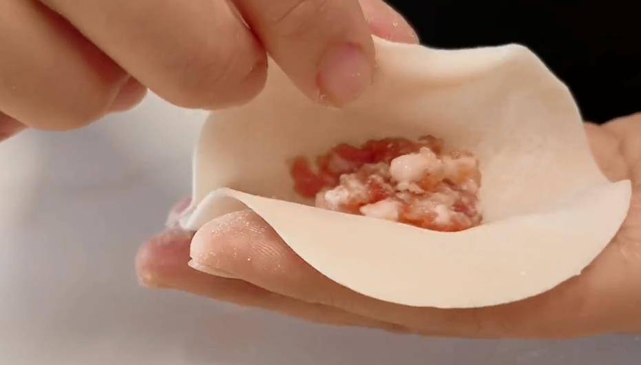 5、拿一张正方形饺子皮,中间放上一点肉末,无需太多,四边中间捏在一起,捏成四个有四个口的造型。