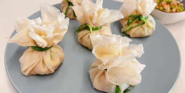 6、可以拿一个小碗,这样方便包入春卷,将春卷皮摊在碗中,将炒好的蔬菜粒放入春卷皮中,收口处用小葱打个结。