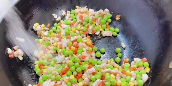 5、锅中倒油,油热后放入鸡肉丁翻炒变色,然后倒入豌豆粒、胡萝卜丁、玉米粒翻炒,撒一勺盐和一勺糖调味。