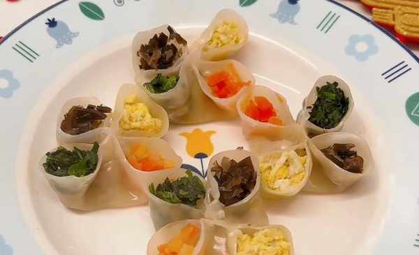 食材:鸡蛋、木耳、菠菜、胡萝卜、饺子皮、猪肉糜