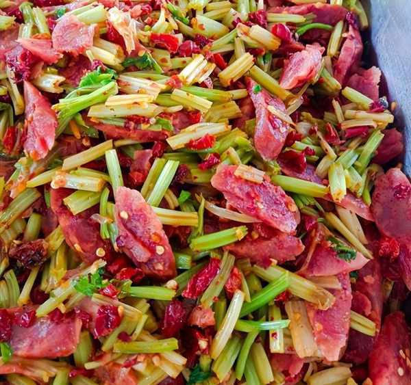 这边的红烧肉也是一绝,切成小块方便入口,肉质好汁水丰盈,咬一口就爆汁。今天用的是胡萝卜来打底,胡萝卜的香甜可以解腻,一勺下去,肉多胡萝卜多,真的太实在。好吃的腊肠和芹菜一起爆炒,火候足炒得很入味,腊肠是甜咸口,肉质紧实而新鲜,芹菜自带香味也很解腻,配一起可以让你开胃。