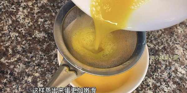 第四步:用一个密密的漏勺过滤掉在搅拌鸡蛋时产生的气泡,这样蒸出来的鸡蛋更加细腻,滑嫩