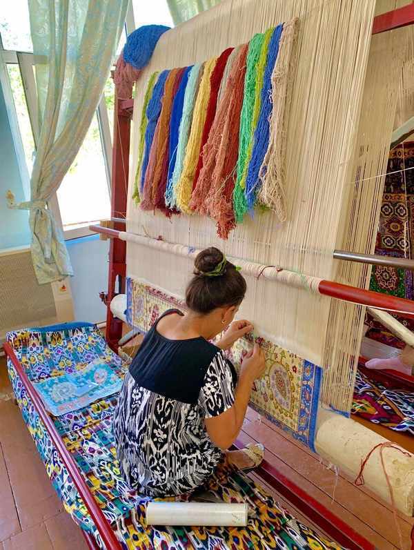 您可以从乌兹别克斯坦买到的最好的东西之一是珍贵的(而且昂贵的)真丝地毯,它完全是手工制作的,直到最后一根线!如果您负担不起,那为什么不带回去旅行的地方呢?我参观了撒马尔罕的一家,看起来很有趣!看到女士们手工做这些,听她们的故事,并学习如何制作的复杂过程(通常要花6个月的时间),使我意识到这件艺术品是无价的。