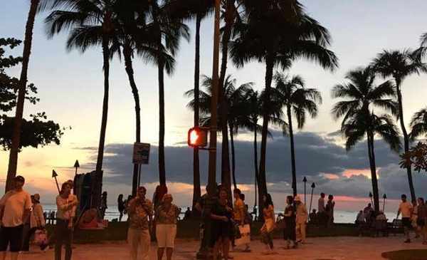 檀香上最热闹最具代表性的的海滩,海岸线比较长,基本来檀香山的都会选择住在威基基海滩边。我们住在希尔顿度假村内,一到周五晚上7点三刻有烟花表演,前面可以边玩边欣赏落日。虽然酒店不是最佳日落欣赏点,但落日余晖还是十分漂亮的。