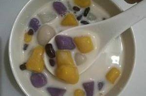 煮好的芋圆和红豆装碗,倒入椰汁即可。