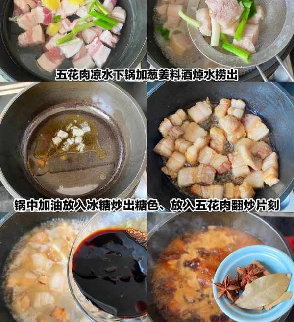 1、五花肉切块,加葱、姜、料酒焯水,捞出洗净;