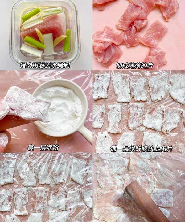 1、猪肉用葱姜水浸泡腌制一会儿,切成薄片;