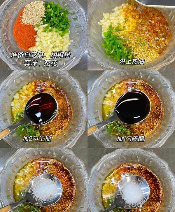 调料:碗中放入葱花、蒜末、辣椒粉、白芝麻,淋上一点热油炸香,加入2勺生抽、1勺陈醋、少许盐和糖拌匀;