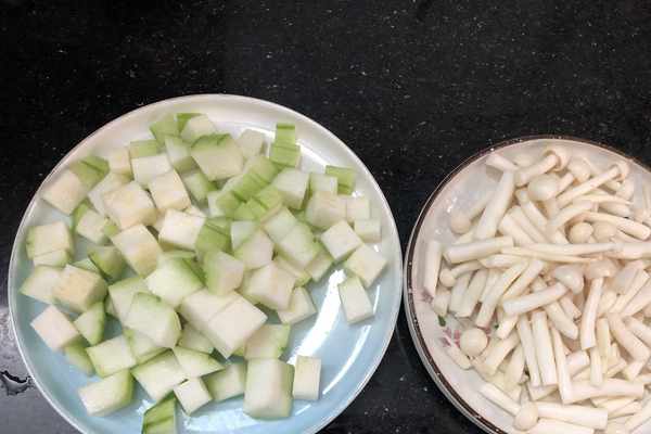 【製作過程】第一步:絲瓜削去外皮,清洗乾淨切成小塊。白玉菇同樣清洗乾淨切小。