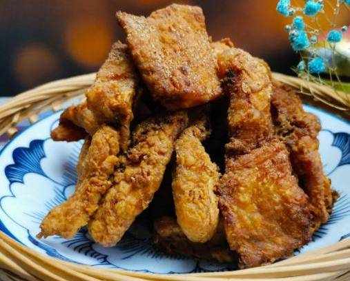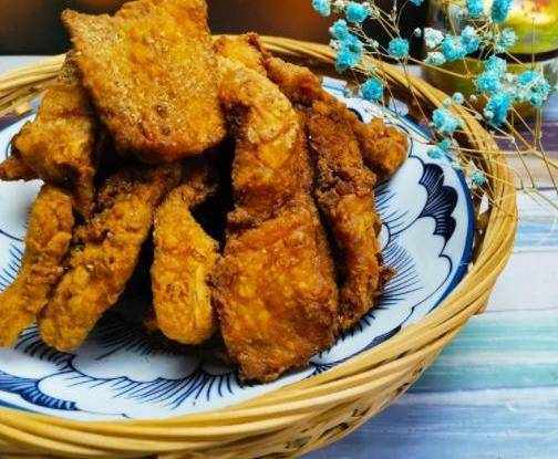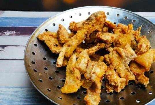 4、把鱼片煎到金黄,取出,把油锅烧到七层,把第一次煎好的鱼片放进油里,翻炒到金色,取出。将烤鱼片放进一个篮子里,上面盖着防潮的面糊,再洒些胡椒粉,就可以吃了。无论是喝酒,还是喝酒,这都是一种理想的搭配。