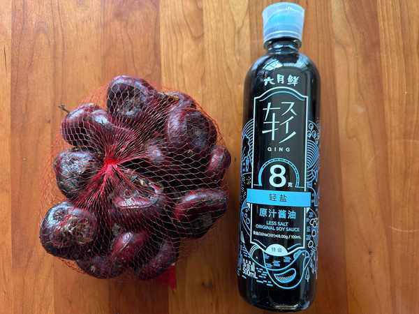 制作配料:荸荠1袋 大蒜2个 蒜苗1根 生抽2勺 盐半勺